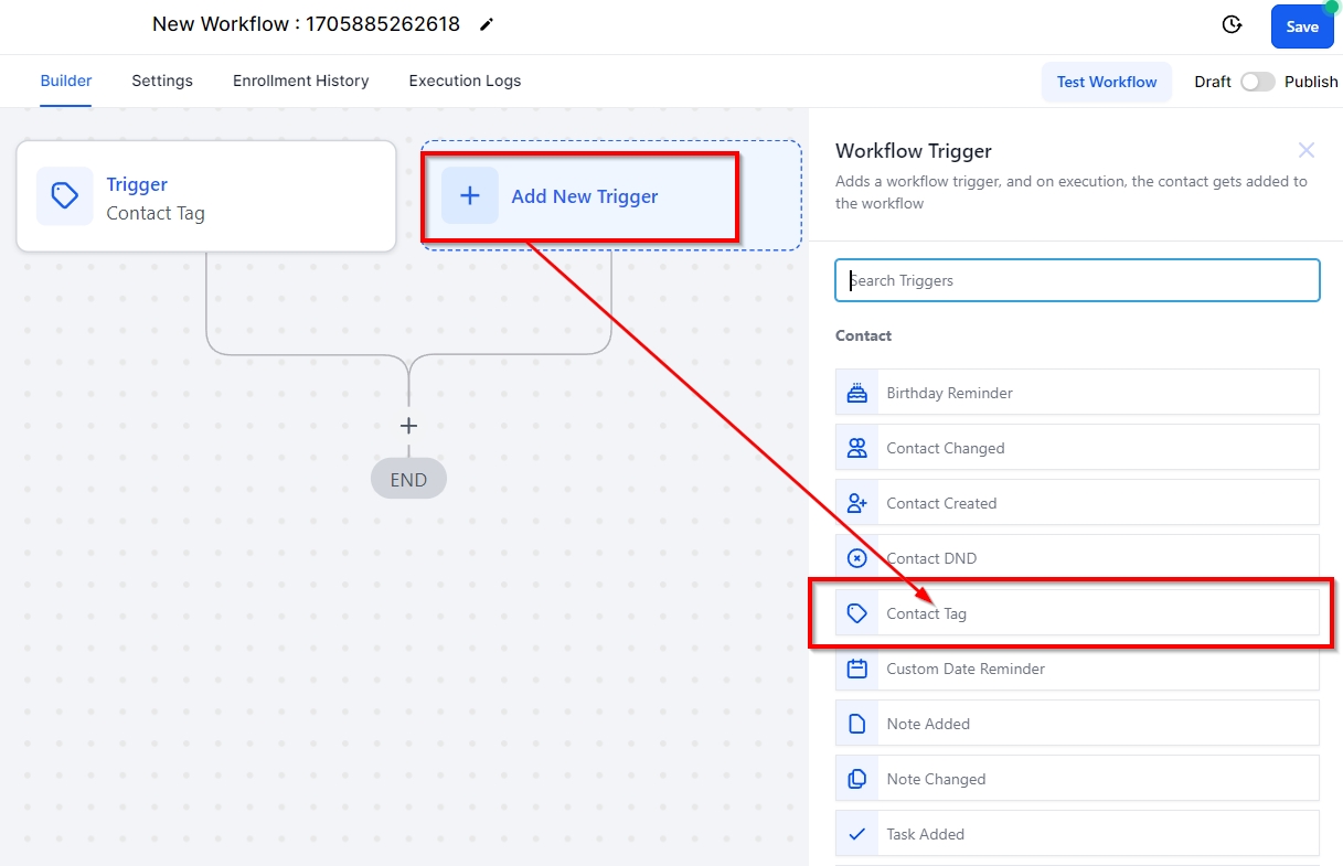 To begin setup, click Add New Workflow Trigger, then select Contact Tag under the Choose a Workflow Trigger dropdown.