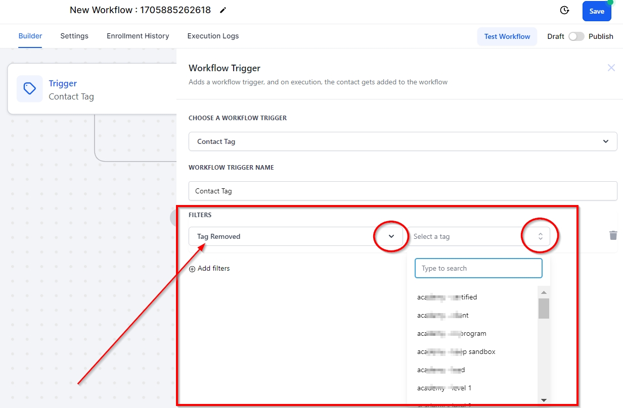 You can also trigger a workflow when a tag is removed from a contact by selecting the Tag Removed filter, and selecting the tag.