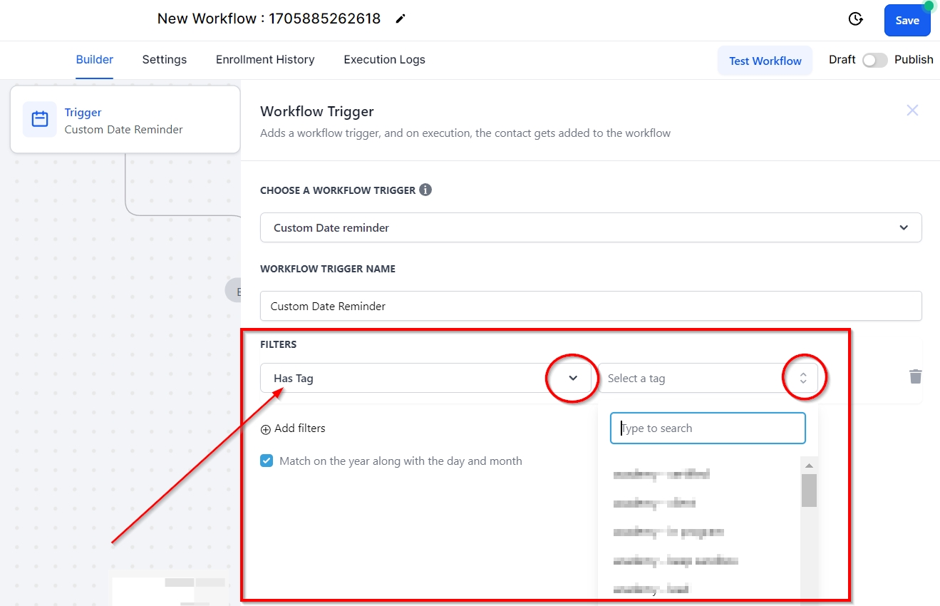 Select a tag from the CRM. When a tag is allocated to the contact's workflow, the workflow will only be triggered based on the specific tag.