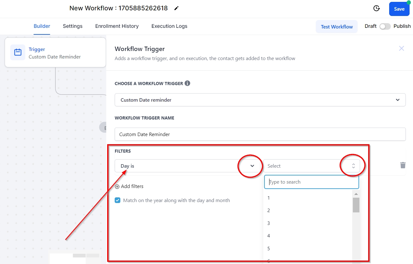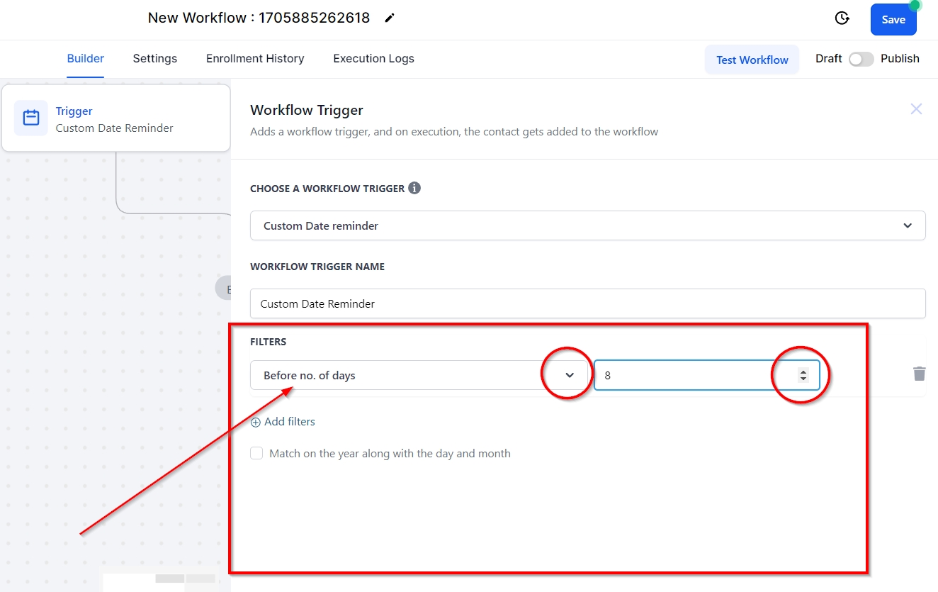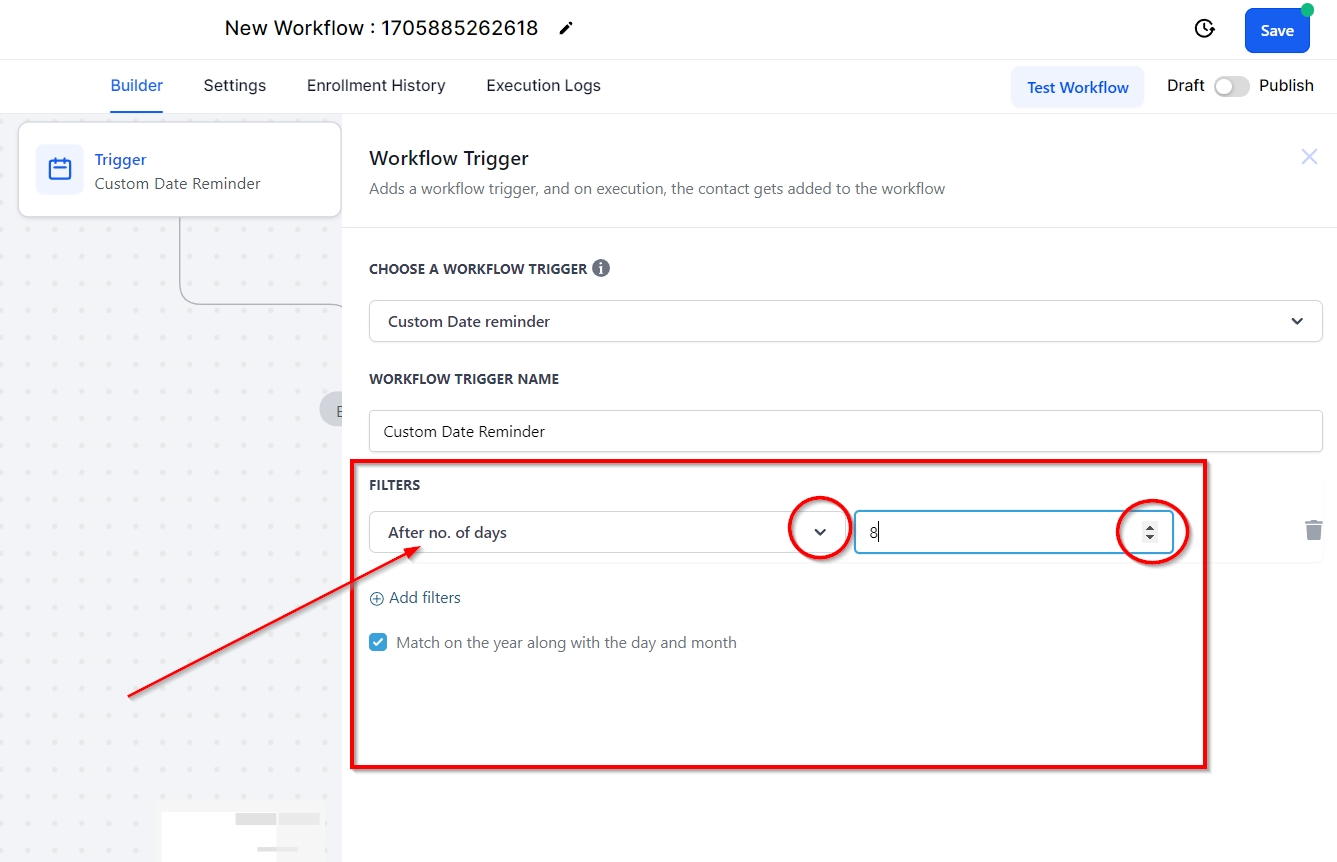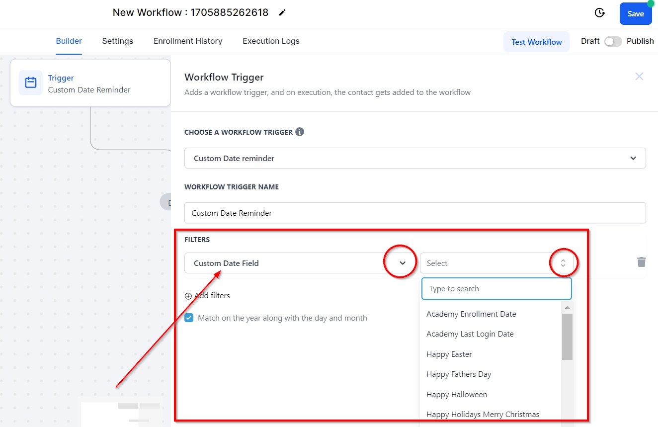 You can select the "Custom Date Field" in the CRM by clicking on this filter. You’ll be prompted to add the days before or after the custom date you would like the workflow to trigger.