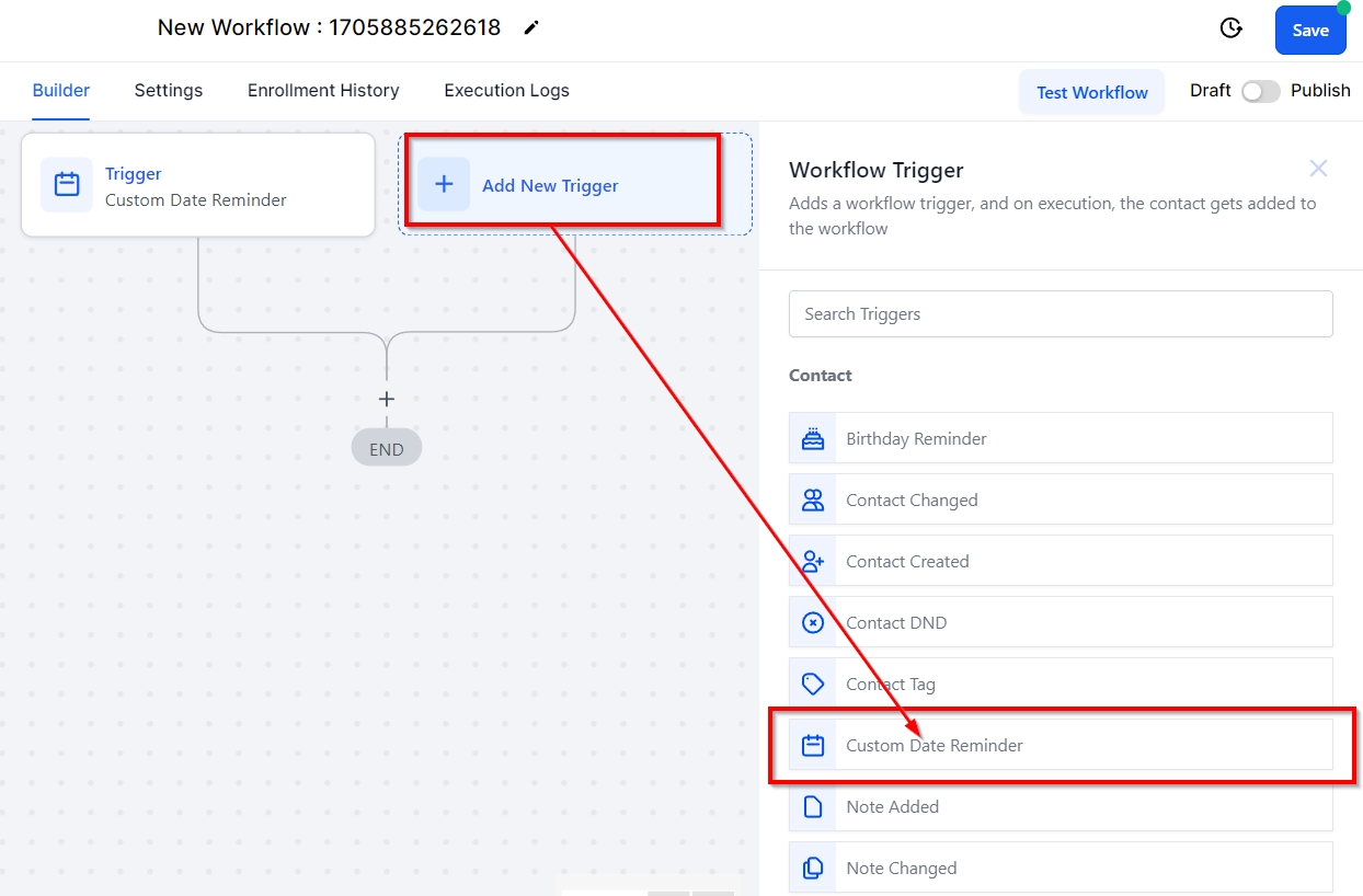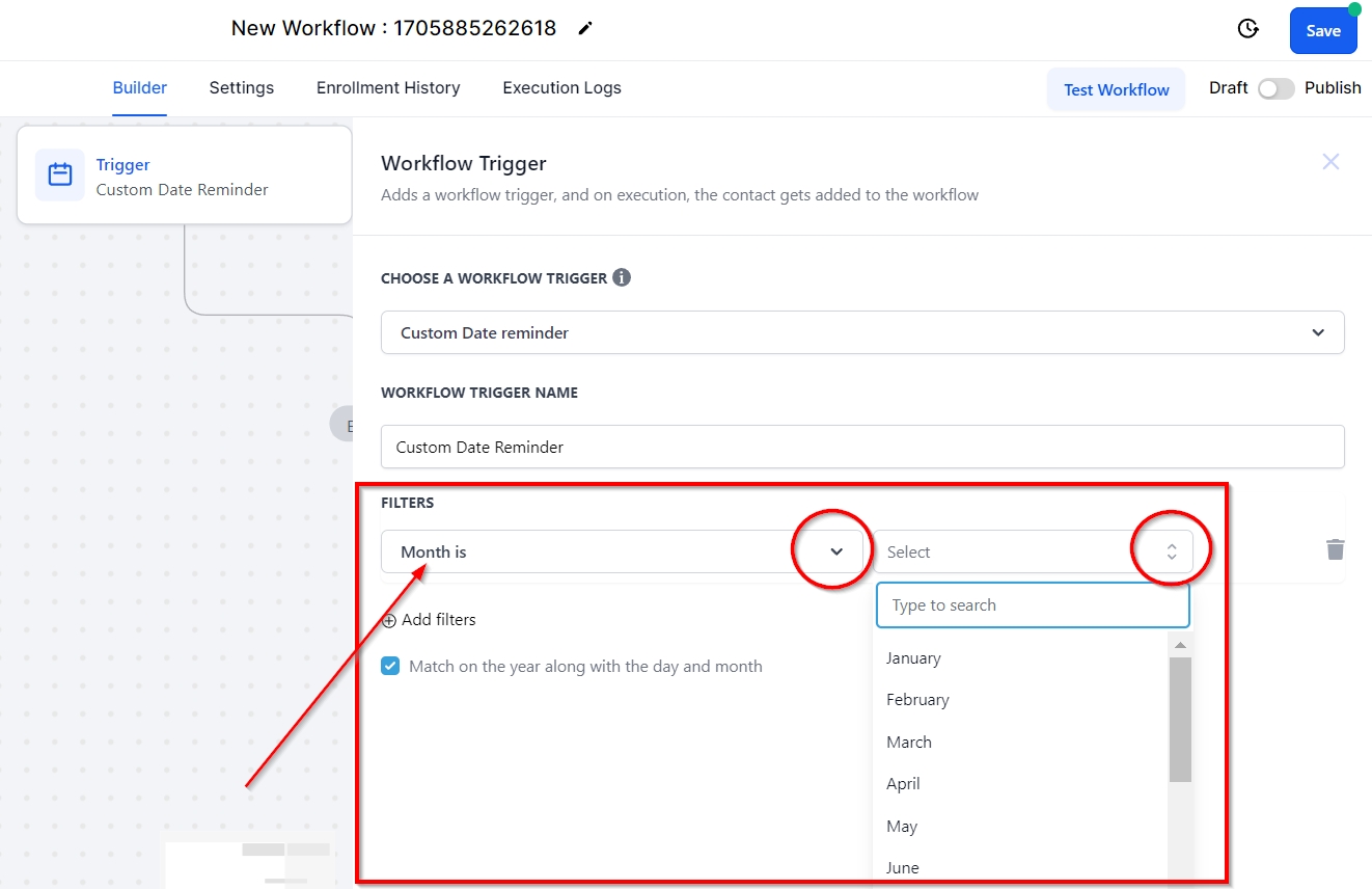 The Custom Date Reminder trigger will trigger the workflow on a specific date that you have set up. This is perfect for sending account review reminders or appointment reminders before a meeting or event. To begin, click on Add New Workflow Trigger, and select Custom Date Reminder from the dropdown menu under Choose a Workflow Trigger. You will need to add a filter with the Custom Date Field, as this will only trigger if a date has already been established in your CRM, for example, account reviews.