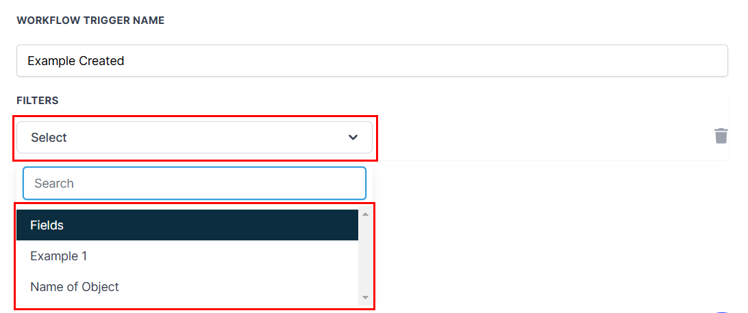 Add filters to specify the conditions by which the workflow should be activated. You will be able to filter by the primary object field name and the name of the object.