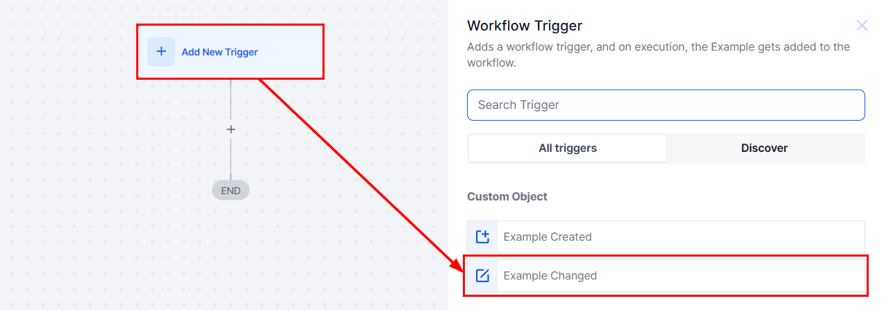 Proceed to rename the workflow, then click the option to add a trigger, selecting the {{Custom Object}} Changed trigger from the list.