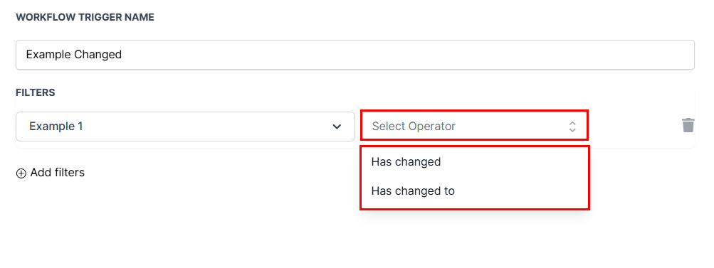 From the dropdown menu, select an operator to finalize the filter configuration. You can specify whether the trigger should activate for all changes or specific changes.