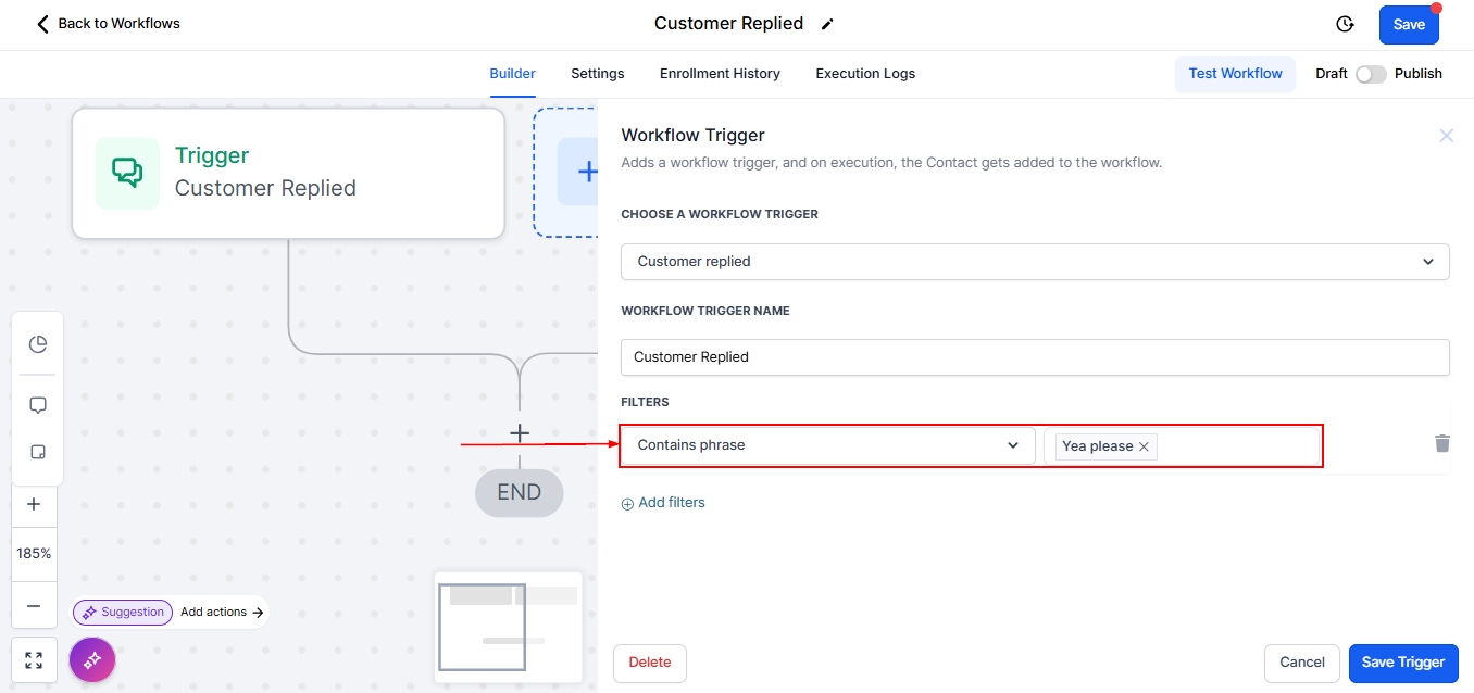 If you only want this workflow to trigger when a specific phrase is used by your customer or lead, you can add that phrase into the "contains phrase" filter. The workflow will trigger as long as the message contains this phrase, regardless of the other words.