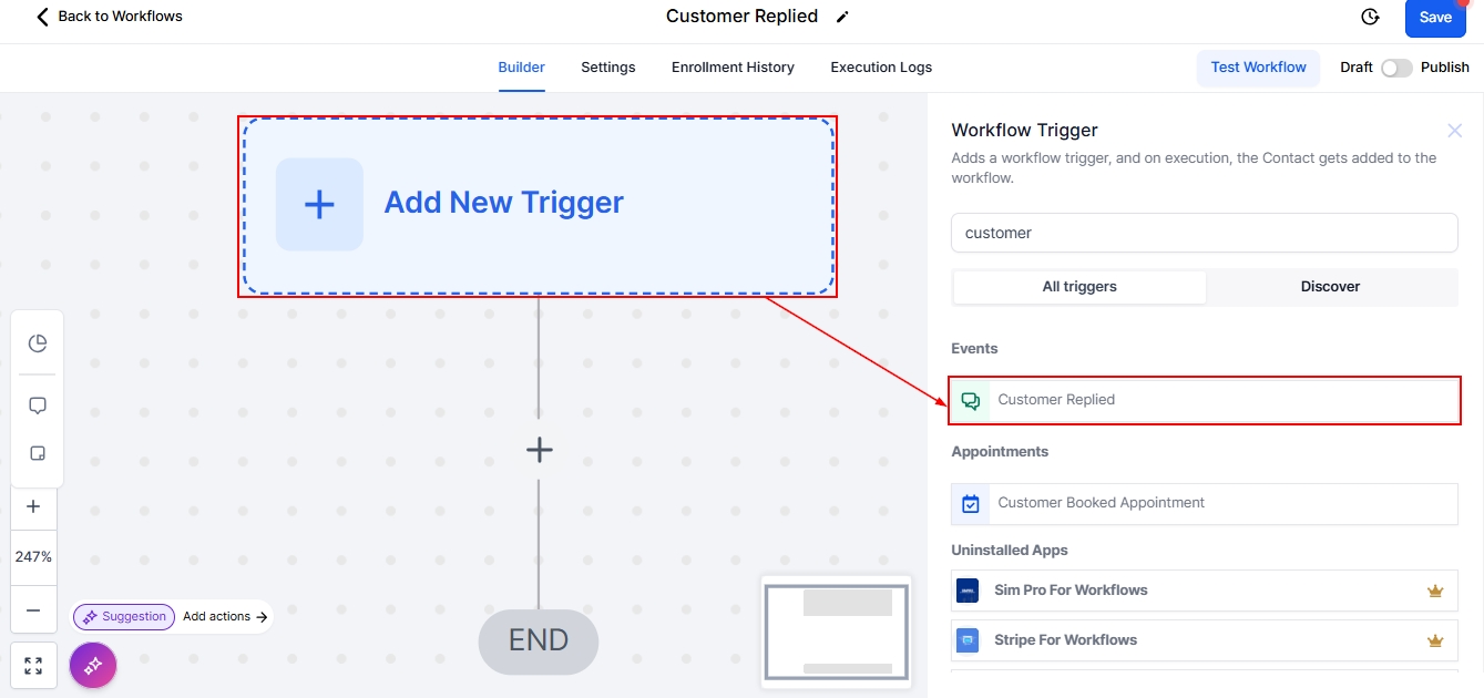 The "customer replied" workflow trigger runs when an incoming message is received from a contact. It is an advanced workflow with a lot of filters and variables. This trigger can be used to build automation that performs actions based on customers replying and even from a specific communication channel such as SMS or Email.