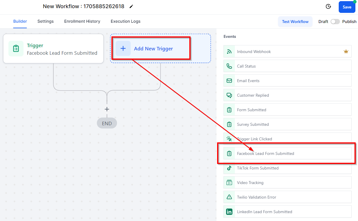 To start setting up your workflow, click Add New Workflow Trigger and select Facebook Form Submitted.
