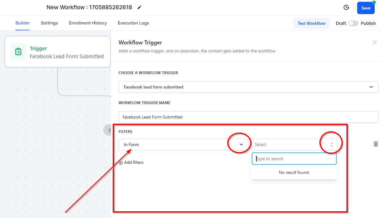 If you want a specific lead form to trigger your workflow, click Add Filter and select Form Is from the dropdown menu. From there, you can select the Facebook lead form that youβd like to trigger the workflow.