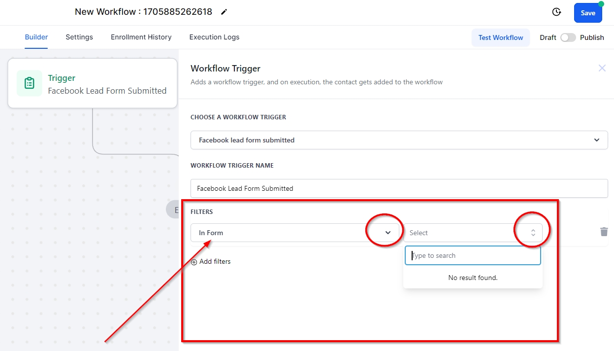 If you want a specific lead form to trigger your workflow, click Add Filter and select Form Is from the dropdown menu. From there, you can select the Facebook lead form that you’d like to trigger the workflow.