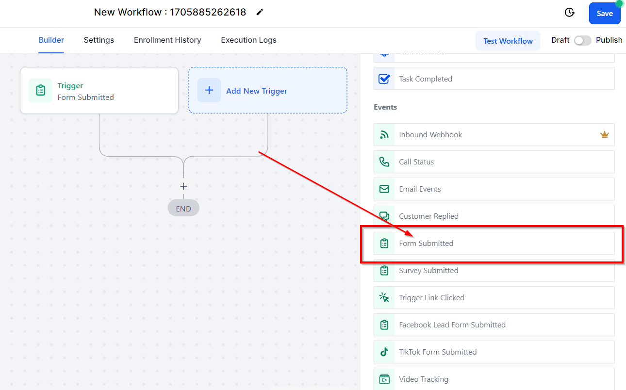 The Form Submitted workflow trigger will run when a form is submitted. Note that this only works if the form was created in your CRM. To get started, click on Add New Workflow Trigger and select Form Submitted from the Choose a Workflow Trigger dropdown.
