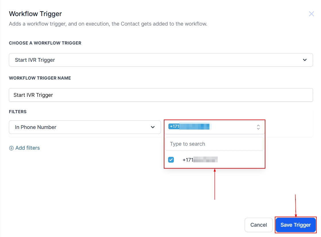 Remember to Add the phone number registered in your CRM and, Save the trigger to activate the entry point.