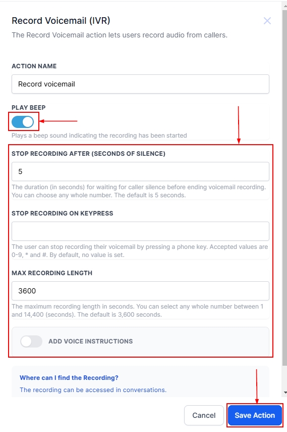 Configure the voicemail action by setting recording preferences, then Save the action to finalize.