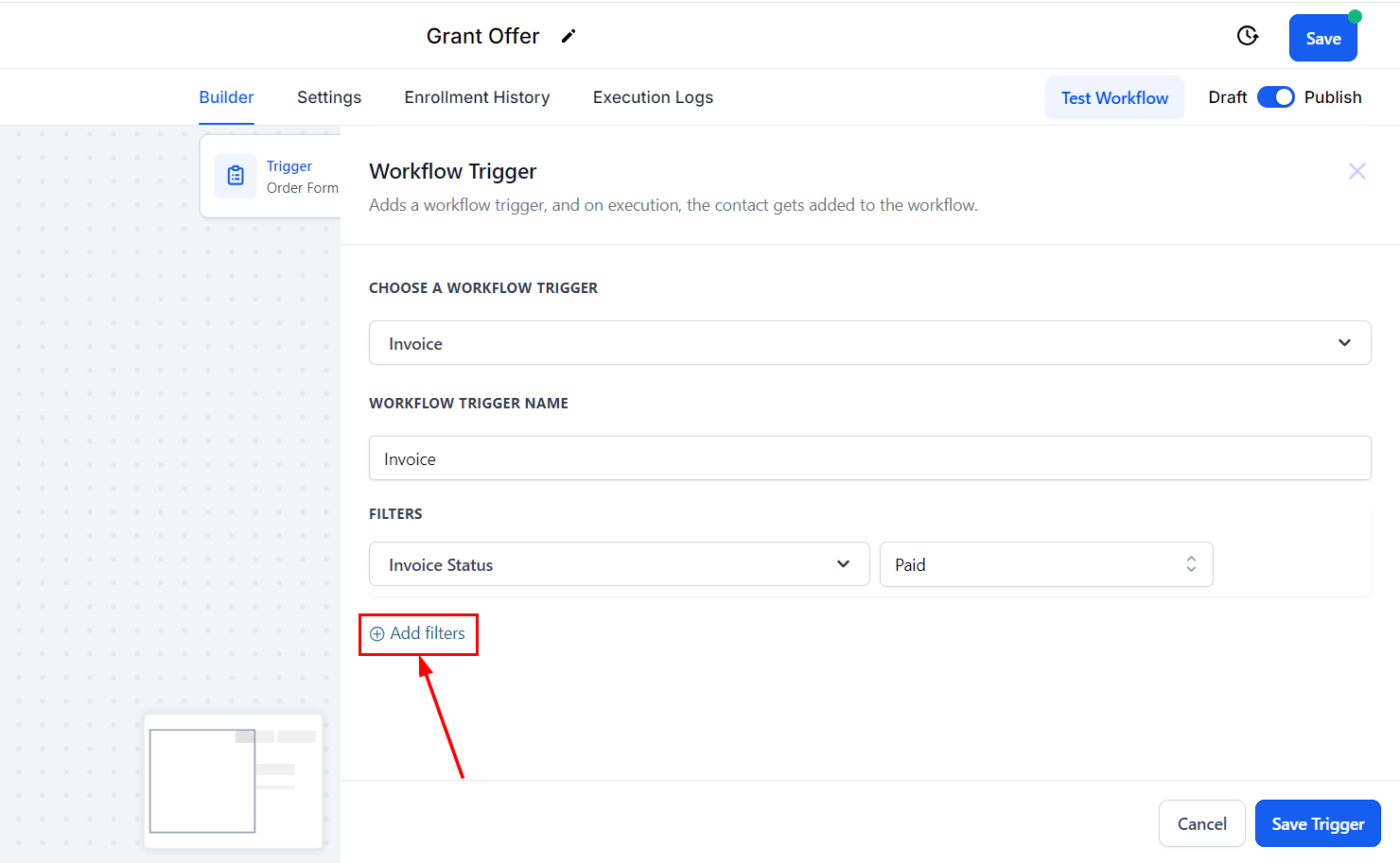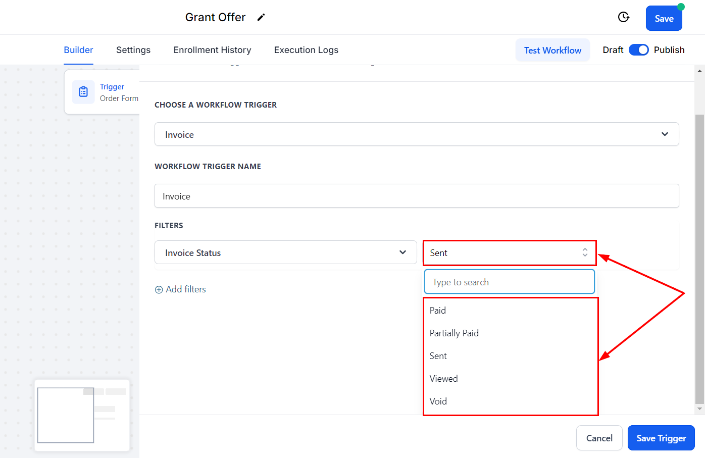 To configure this trigger, click on the Add New Workflow Trigger button within a workflow and choose the Invoice option from the available selections.