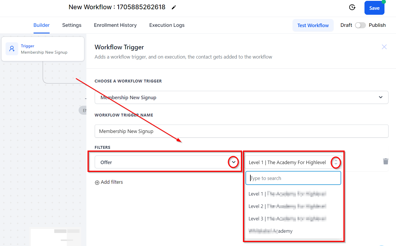 To further filter your trigger, select Add Filters and click on Offer. A drop-down menu will appear for you to select the membership type. Once youโve selected your filters for your trigger, click on the green Save Trigger button in the bottom right corner.