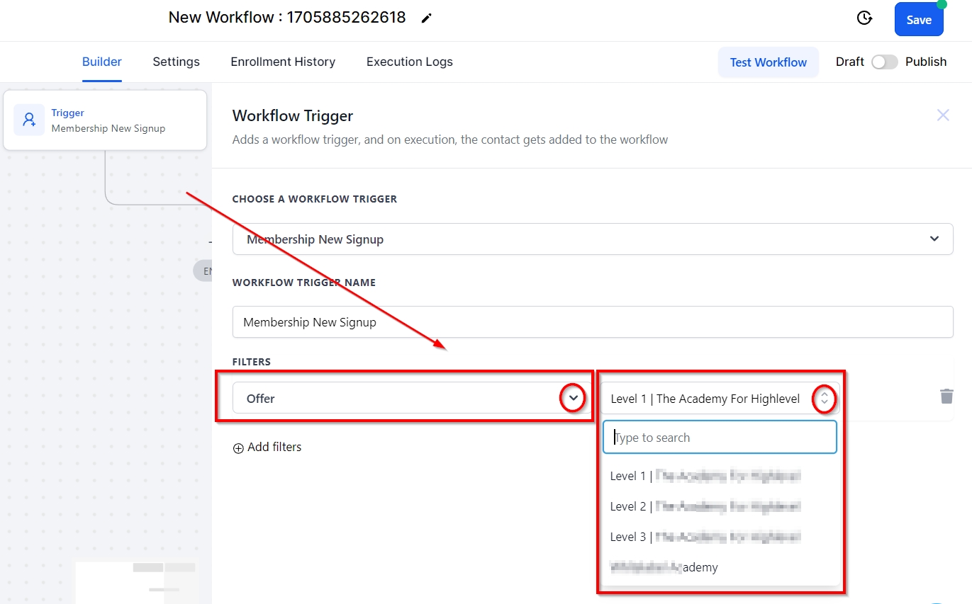 To further filter your trigger, select Add Filters and click on Offer. A drop-down menu will appear for you to select the membership type. Once you’ve selected your filters for your trigger, click on the green Save Trigger button in the bottom right corner.