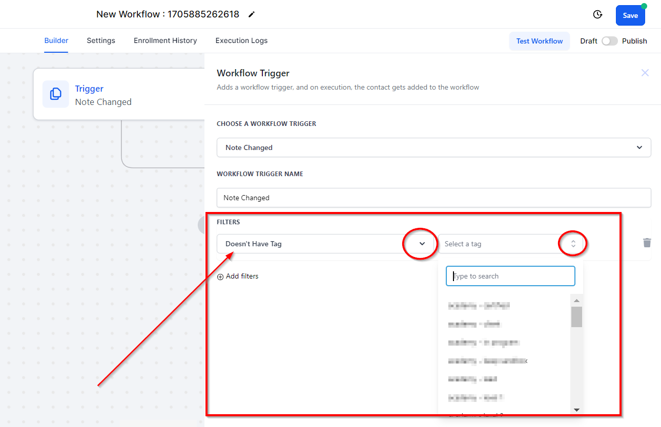 By selecting the "has tag" filter, the workflow will only fire when a note is added to a contact who has the specified tag.