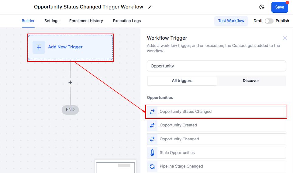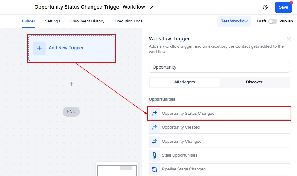 To get started, click on “Add New Trigger”, then search and select “Opportunity Status Changed”.