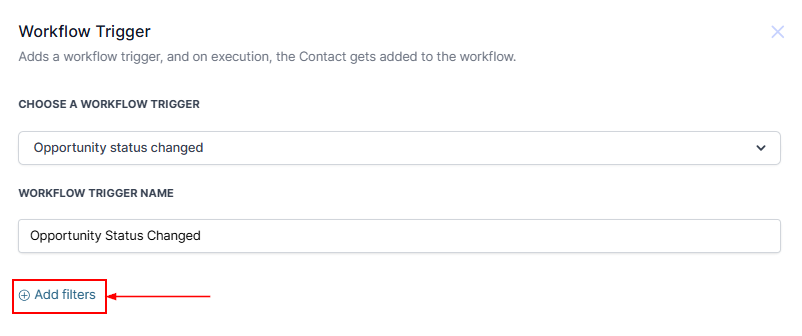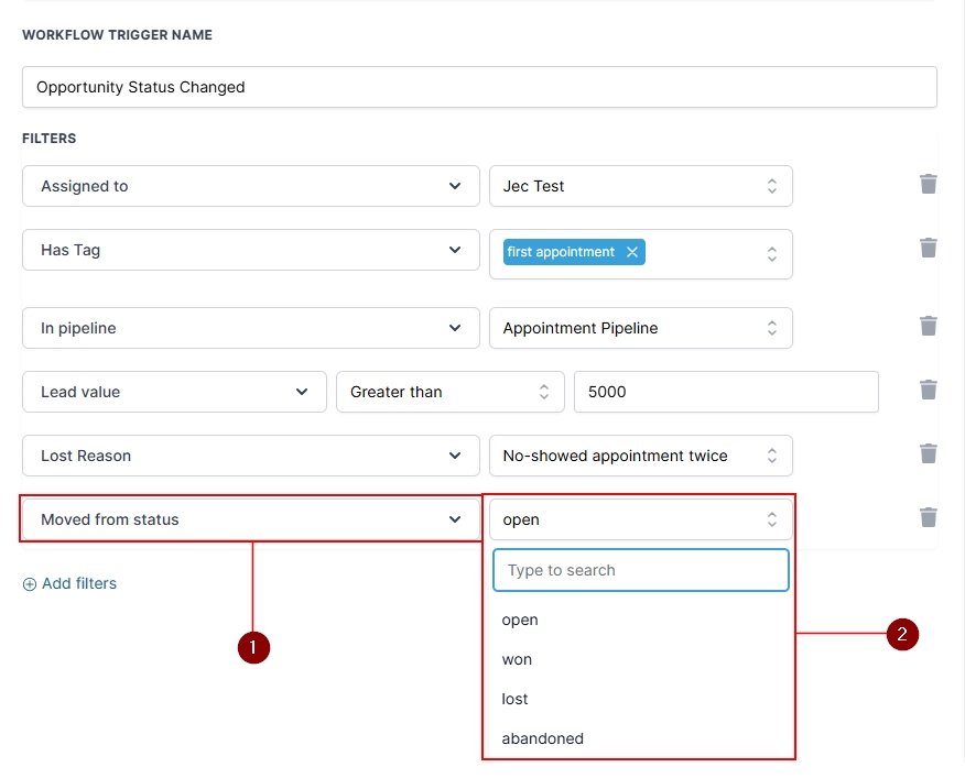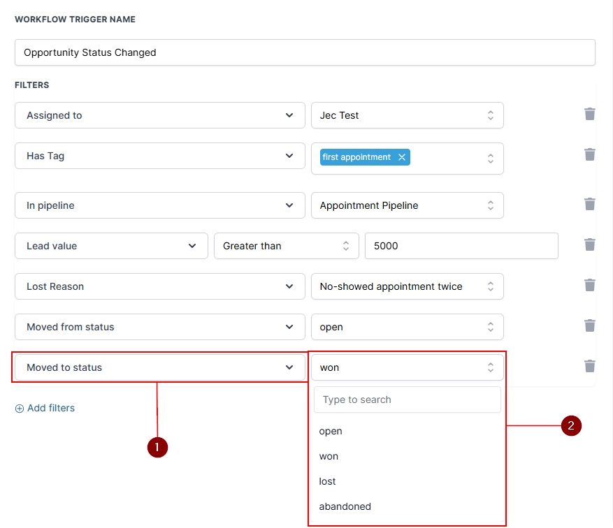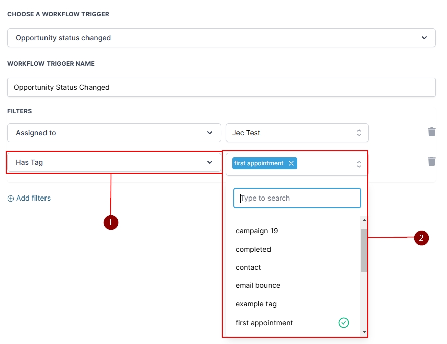 In the filter options, choosing "Has tag" will trigger the workflow when an opportunity card with a specific tag moves from one status to another. For instance, this filter will only activate the workflow when an opportunity card with a First Appointment tag moves from the open status to the won status.