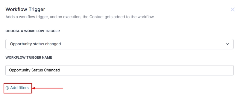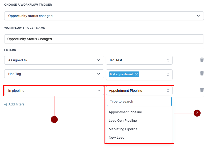 Selecting the In Pipeline filter will activate the workflow only when an opportunity card in a specific pipeline moves from one status to another. For instance, if an opportunity card in the Appointment pipeline moves from open to abandon status, this filter will trigger the workflow.