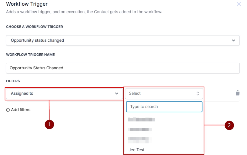 The "Assigned To" filter allows you to trigger the assignment of a Contact to a User based on a condition of your choice. Simply select a team member from the dropdown to select the Assigned To.