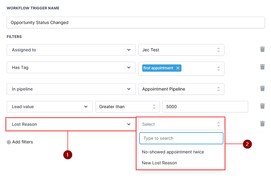 Track opportunities lost for specific reasons by using this filter to activate workflows when an opportunity is marked as lost with a defined cause.