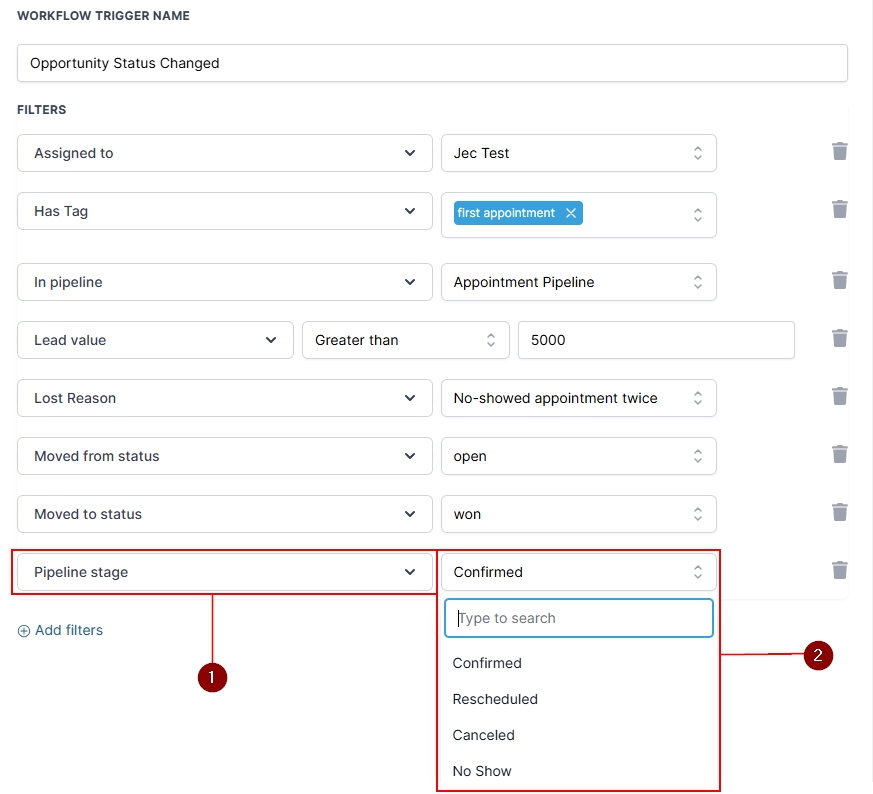 For instance, if Confirmed is chosen in the Appointment pipeline, this filter will only activate the workflow when a customer moves to that stage.