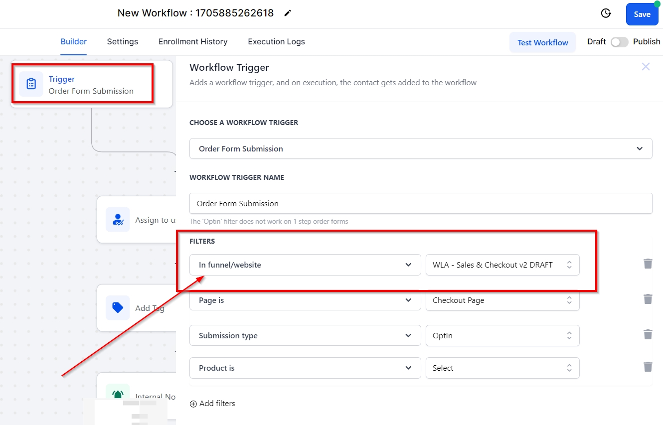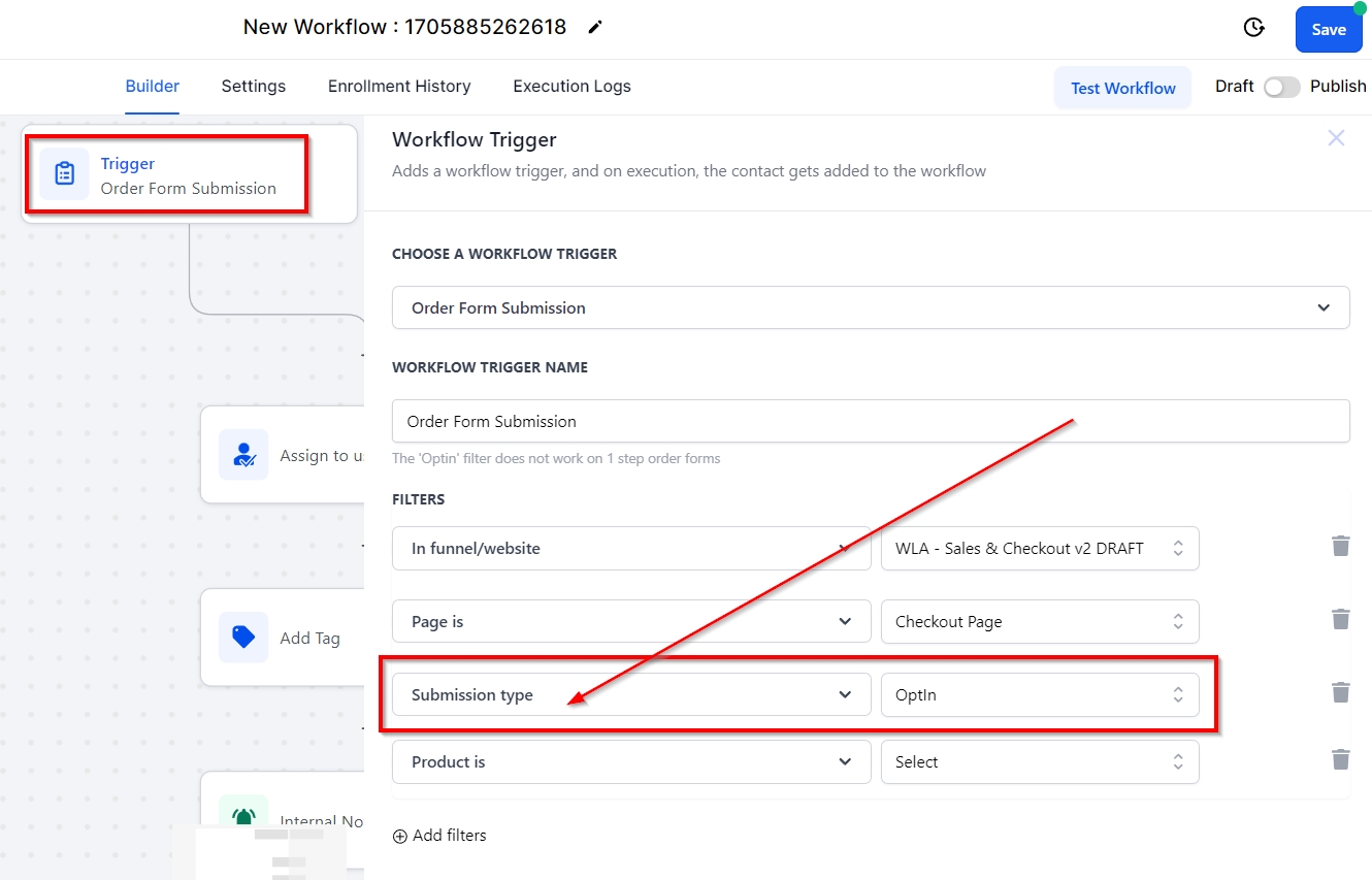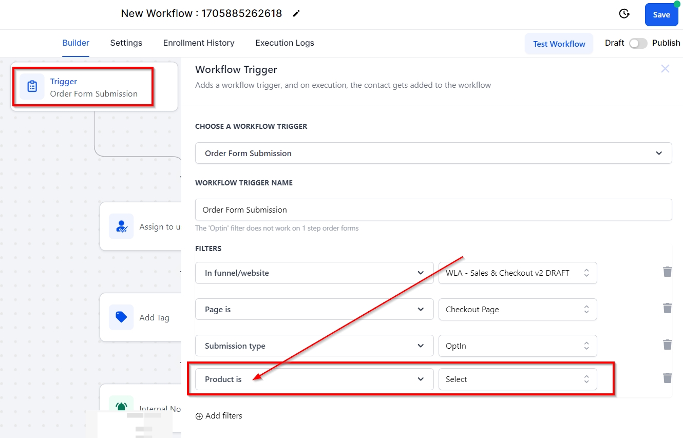 The "Product Is" filter option in this trigger could be used when you want a specific product in your funnel or website to trigger the workflow when a customer fills it.
