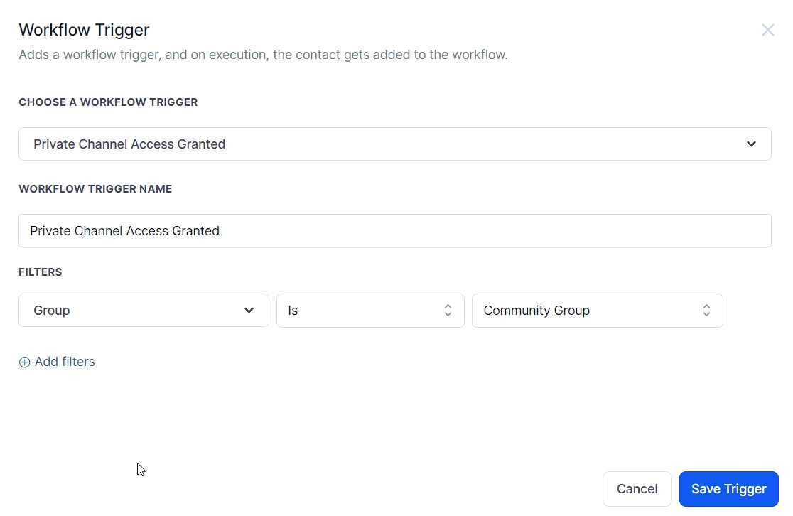 The Private Channel Access Granted Trigger allows you to automate processes based on a user gaining access to one of your Community Private Channels such as sending follow-up emails, notifying team members, or providing access to another channel.