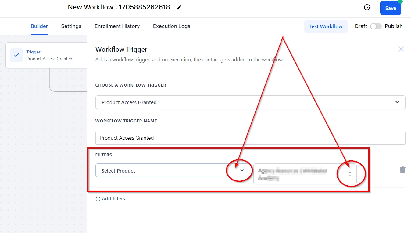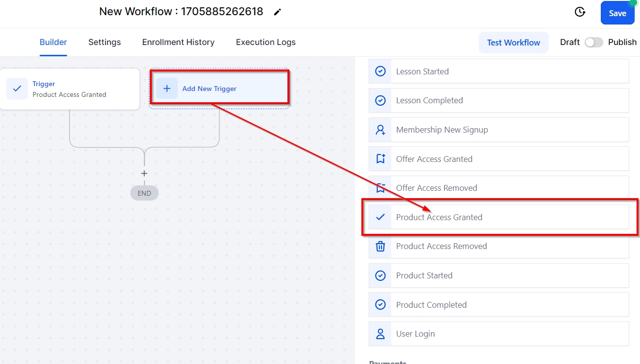 Users should click the Add New Workflow Trigger button to incorporate this trigger and opt for the Product Access Granted option from the provided list.