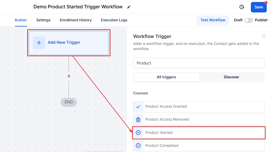 To configure the Product Started trigger, click on the Add New Trigger button, search, and choose the Product Started option from the available selections.