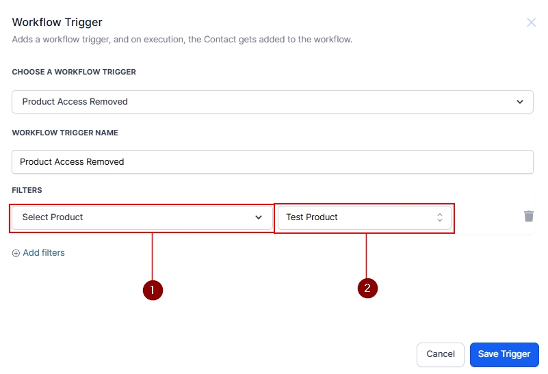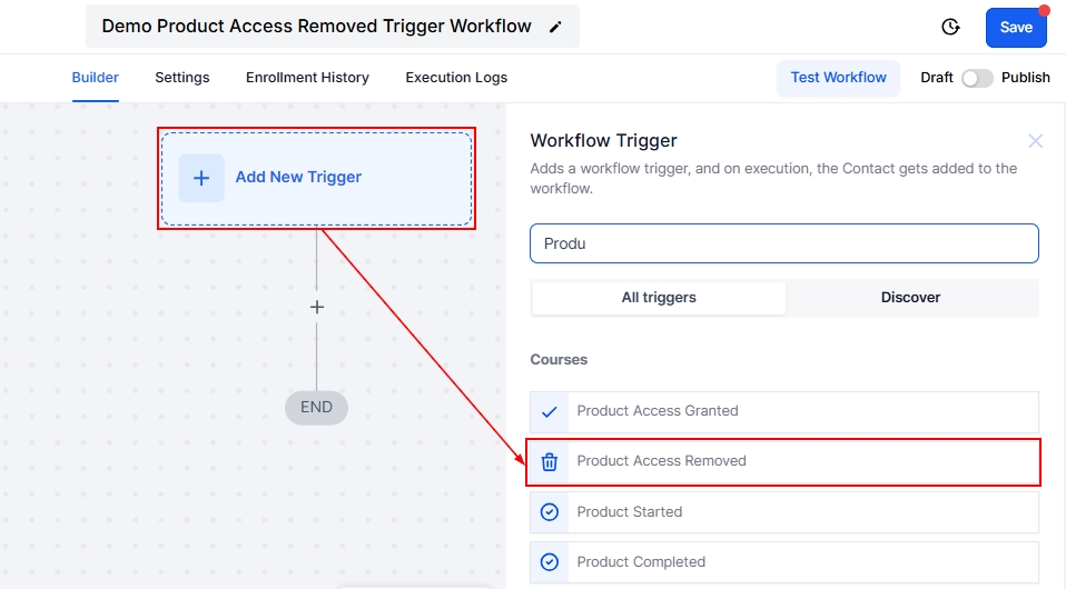 To enable this trigger, click on the "Add New Trigger" button, then search and choose the “Product Access Removed” option from the available choices.