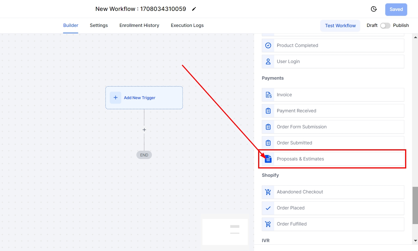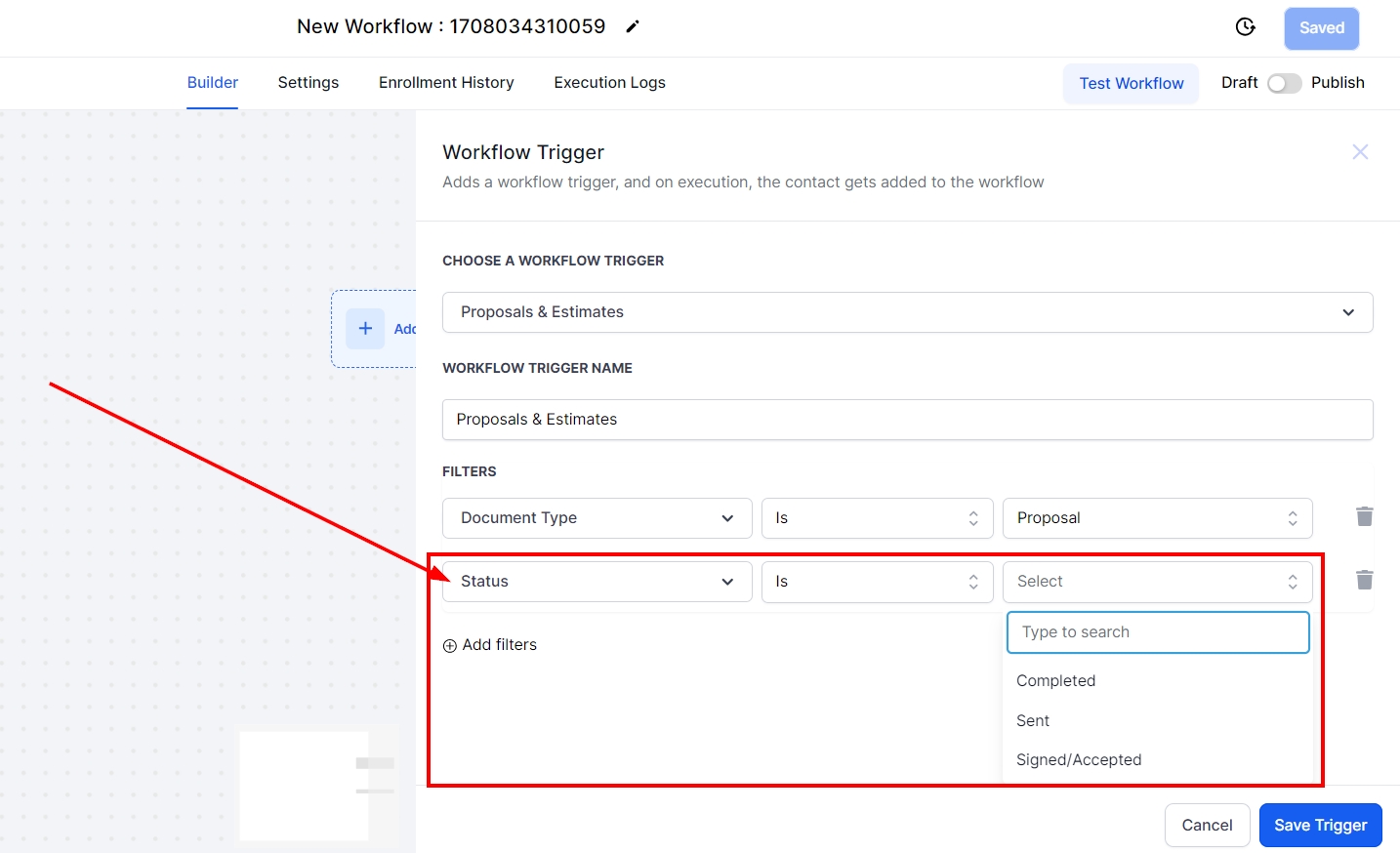 Business users can utilize the Proposals and Estimates trigger to trigger a workflow for use cases based upon the change in the state of a document. This will allow businesses with multiple use cases, like updating opportunity tags, sending an invoice, attaching tags to contacts, or maintaining any record through actions like Google Sheets/Slack after the proposal/estimate has been sent/signed by one of the recipients or completed by all participants.