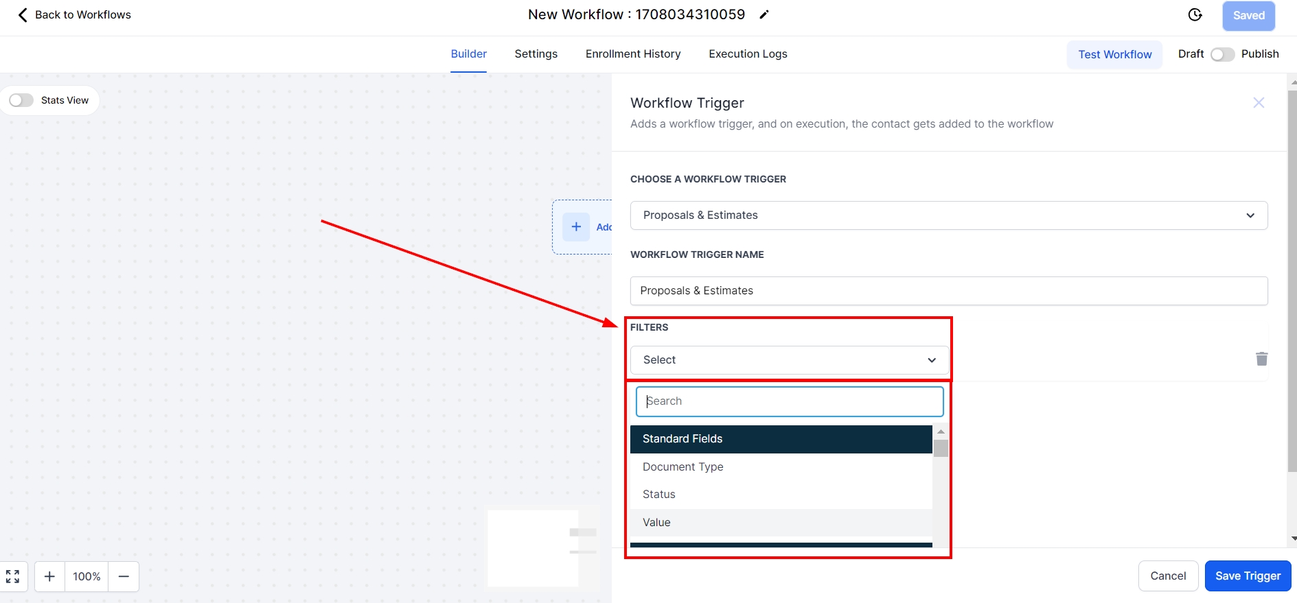 Users will be able to filter the trigger based on specific conditions like the document status, or value or the document typeThe most common use case can be to trigger a workflow based on the document status.
