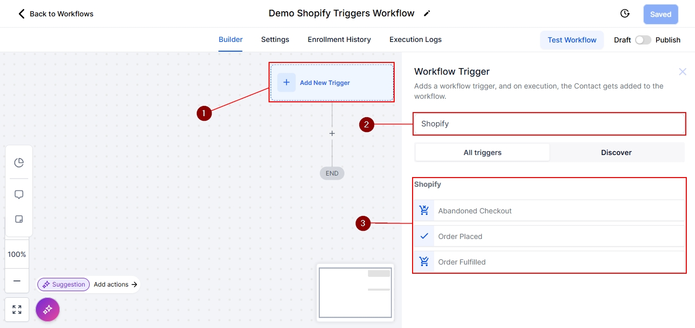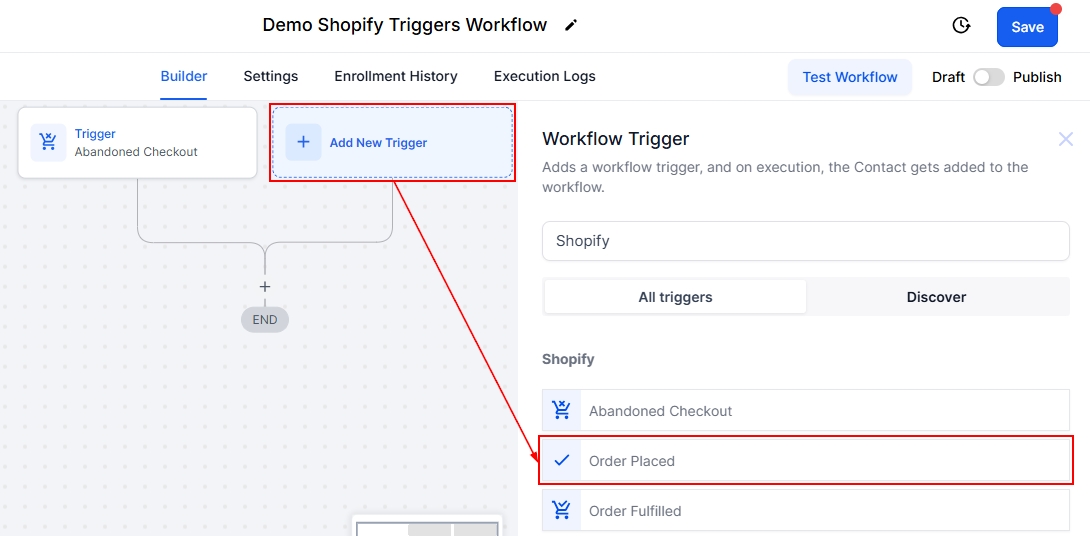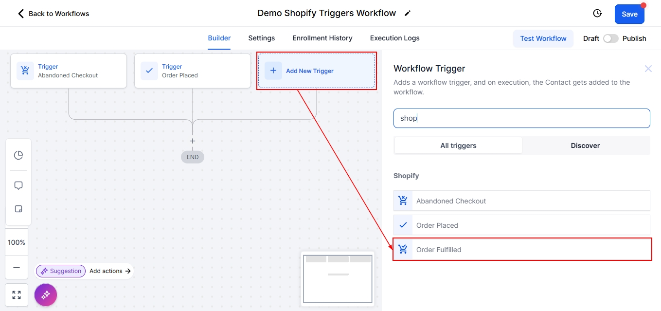 As you create workflows and incorporate workflow triggers, you'll discover a category called Shopify Triggers. These triggers are specifically designed to streamline your e-commerce operations on the Shopify platform by automating essential processes such as monitoring incomplete checkouts, tracking placed orders, and confirming order fulfillment.