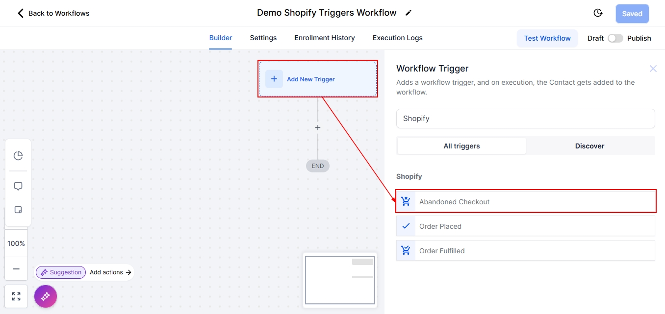 The Abandoned Checkout trigger allows businesses to reconnect with customers who browsed products but did not complete their purchases. This trigger can help recover lost sales by enabling workflows that send reminders, offer incentives, or address potential concerns that may have deterred buyers.