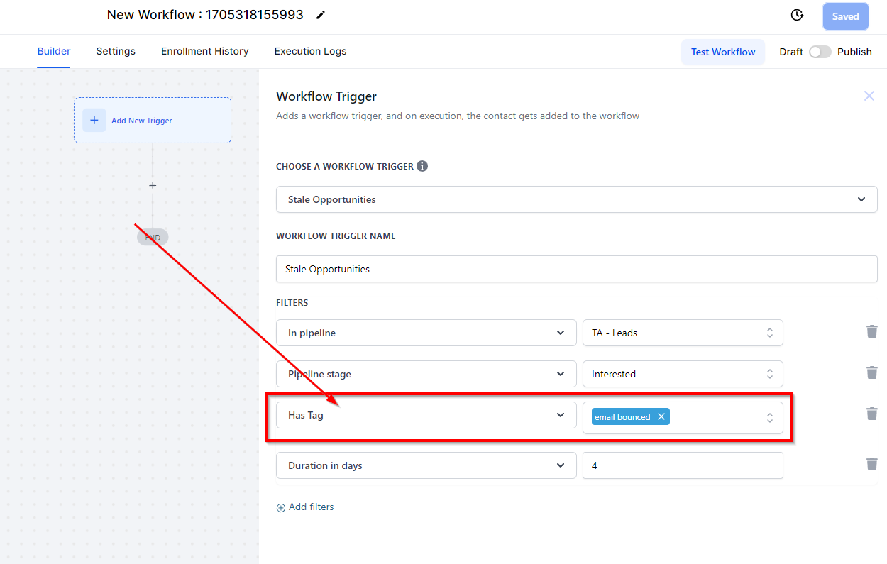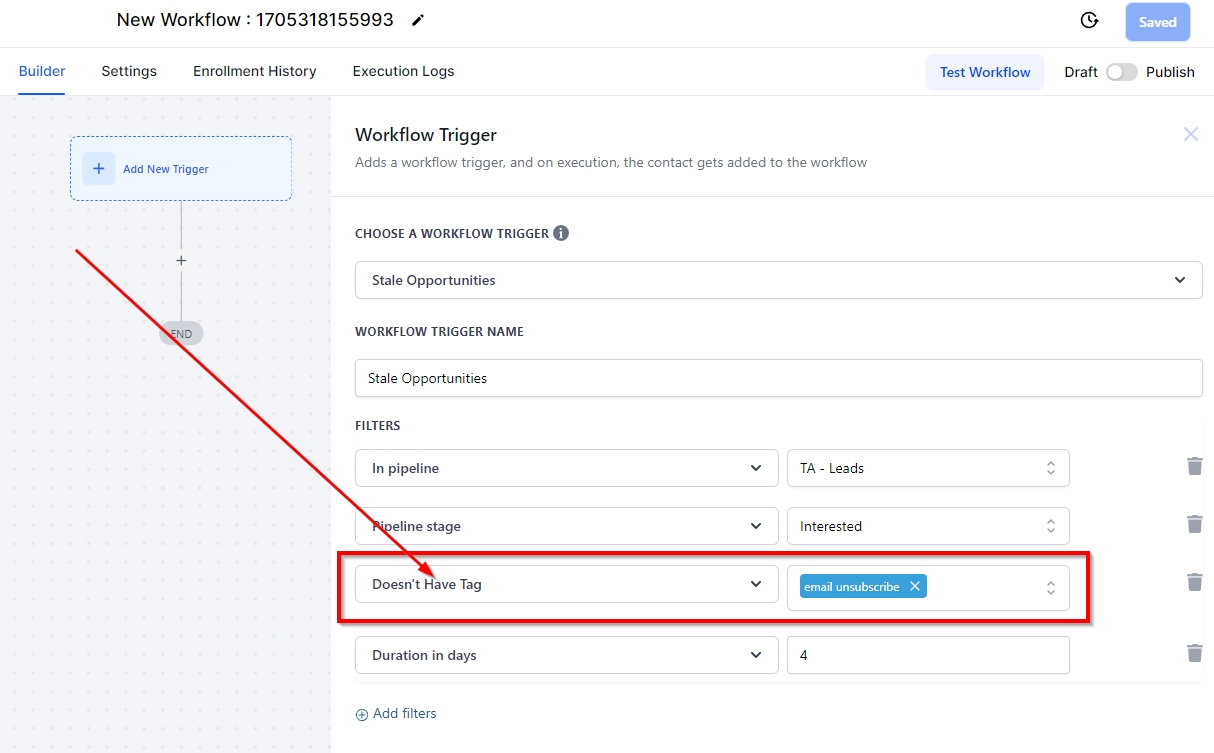 By selecting the Doesn't Have Tag filter, the workflow will activate only when an opportunity card in the Open status of a pipeline has exceeded its set timeframe and does not have a specific tag.