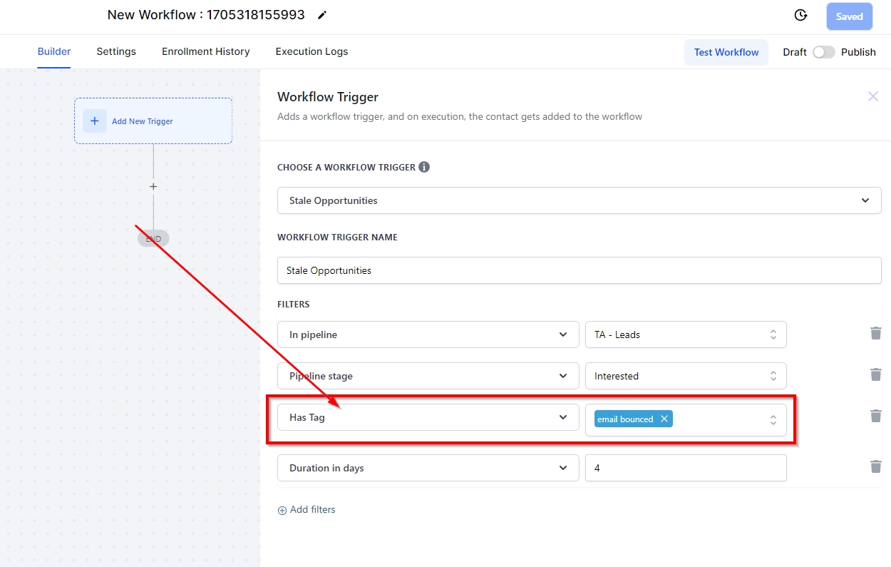 By selecting the Has Tag filter, the workflow will only trigger when an opportunity card in the Open status of a pipeline has a specific tag and has exceeded its set timeframe.