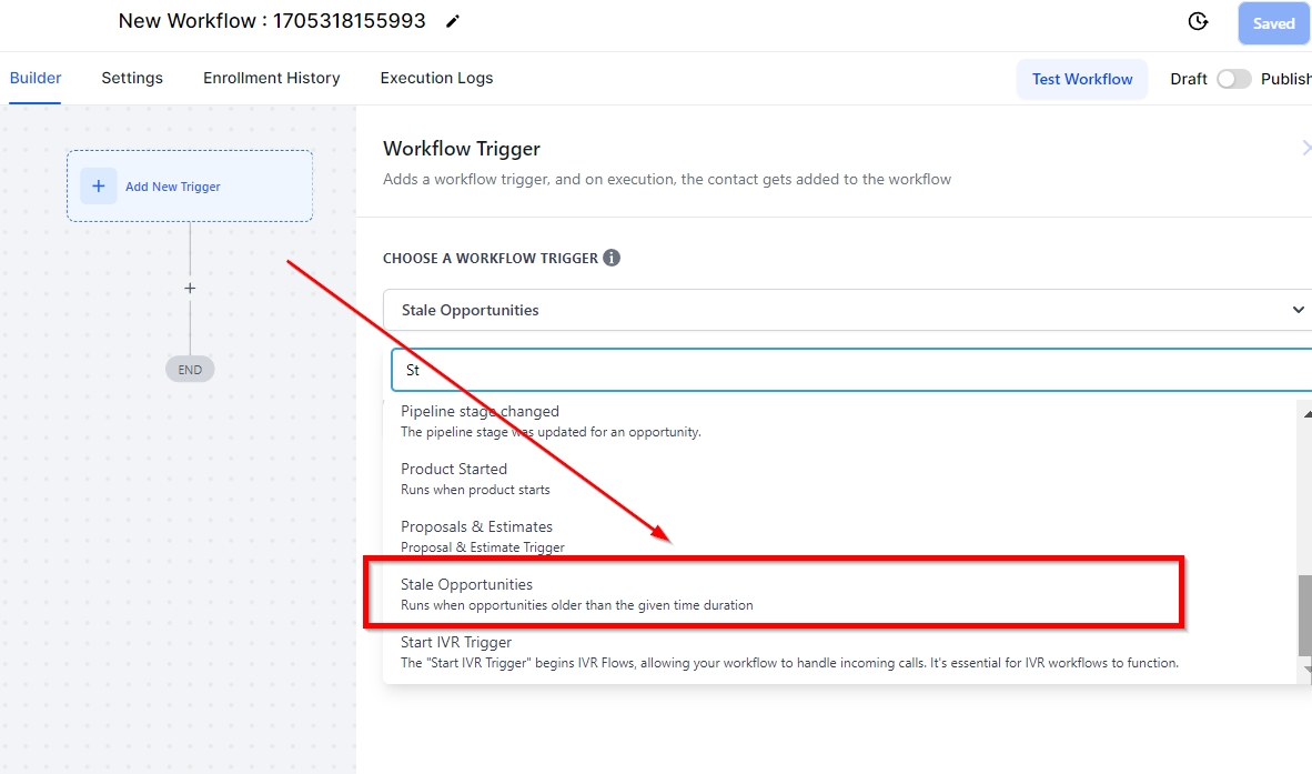 To get started, click on Add New Workflow Trigger and select Stale Opportunities.