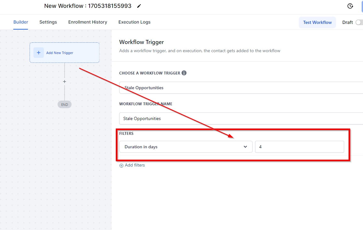The Duration of Days filter is used to identify and trigger workflows for stale opportunities. This filter only activates the workflow when the set timeframe for an opportunity card has been exceeded, labeling the opportunity card as stale.