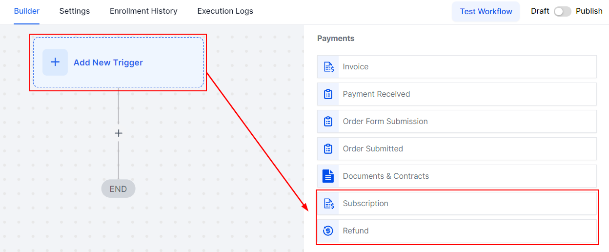 Subscriptions and refunds are two big tells of how a customer's journey is going, they may be the perfect point to engage more with them or the moment to cut things off. But you may not have the time to keep checking on those details with each customer, right? That's where workflows come in handy, especially with the “Subscription” or “Refund” triggers.With their help, you can step up full workflows for your contacts to experience as soon as their status changes. To start, add a new trigger, you can find these two under Payments.