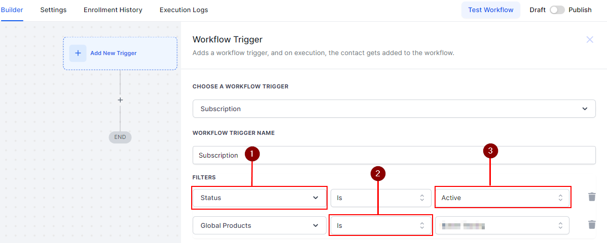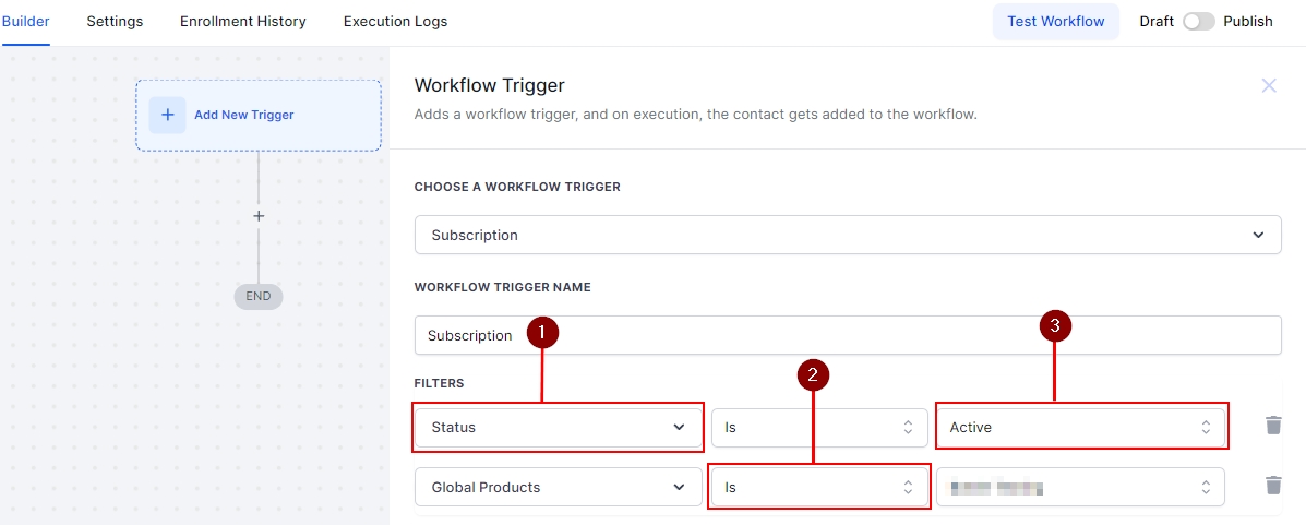 For both triggers the beginning will be the same, pick one of the two. After selecting it click on Add Filters, you can get as specific as needed. However, here's where things get different between them. For Subscription, the main filters will be Status and Global Product. The steps will pop up in the following order: