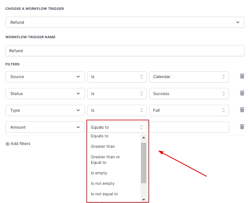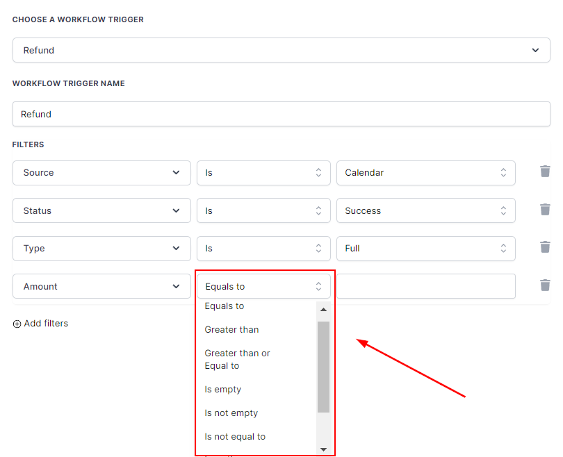For Refunds, the main filters will be Amount, Source, Status, and Type. They work the same as the ones we showed you for the Subscription except for the Amount. In that case, the operator has more options and the value is not a drop-down menu instead you can freely set the total.