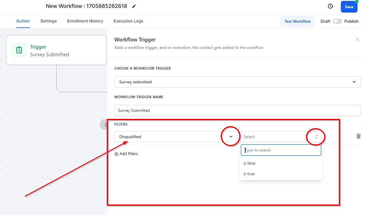 To get started, click on Add New Workflow Trigger and select Survey Submitted. You can filter your trigger by clicking Add Filter and selecting Disqualified, or Survey Is.