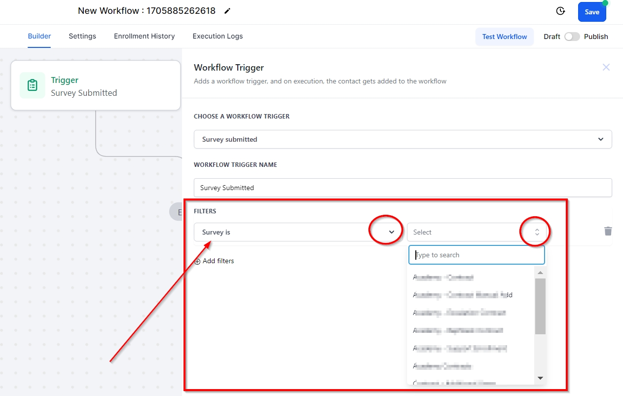 The Survey Submitted trigger is designed for specific actions after a lead submits a survey. This trigger activates each time someone submits a survey, thus triggering the workflow created for the task. This feature allows businesses to streamline their workflow and automate certain actions based on survey submissions, resulting in improved efficiency and a more personalized customer experience.