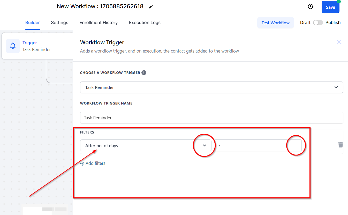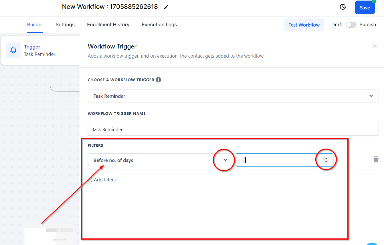 To add a filter, click on the Add Filter button. Here you have the option to trigger the workflow before or after a number of days or even based on custom fields.