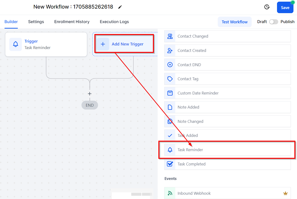 The Task Reminder workflow trigger will allow you to trigger a workflow based on a task that has been created previously in your CRM. This will help you create task reminders based on the nature of your work. To begin, click on Add New Workflow Trigger, and select Task Reminder under Choose a Workflow Trigger.