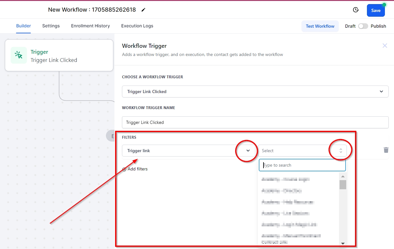 You can filter your trigger link by clicking Add Filters and selecting Trigger Link. Here you can select the trigger link you would like to use for the workflow.