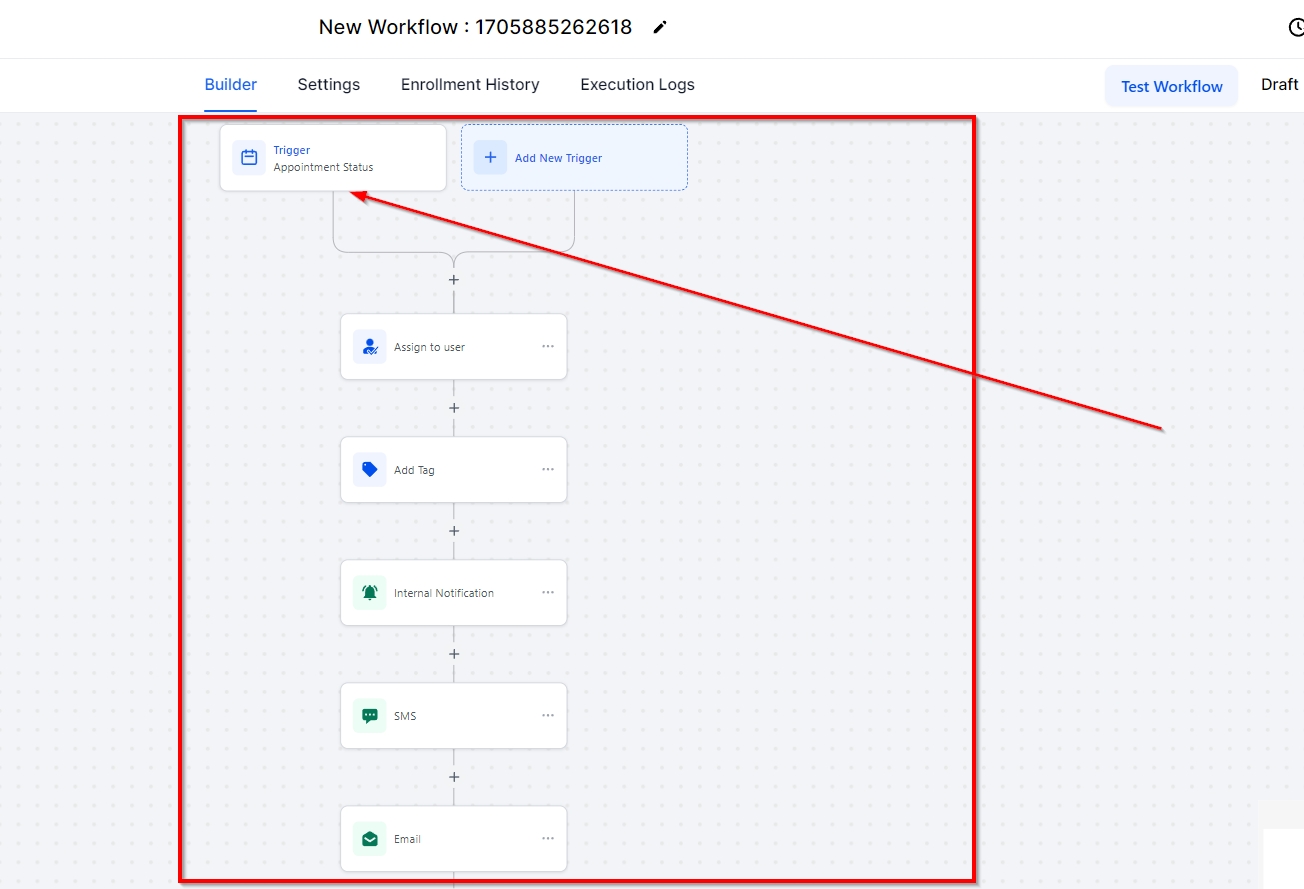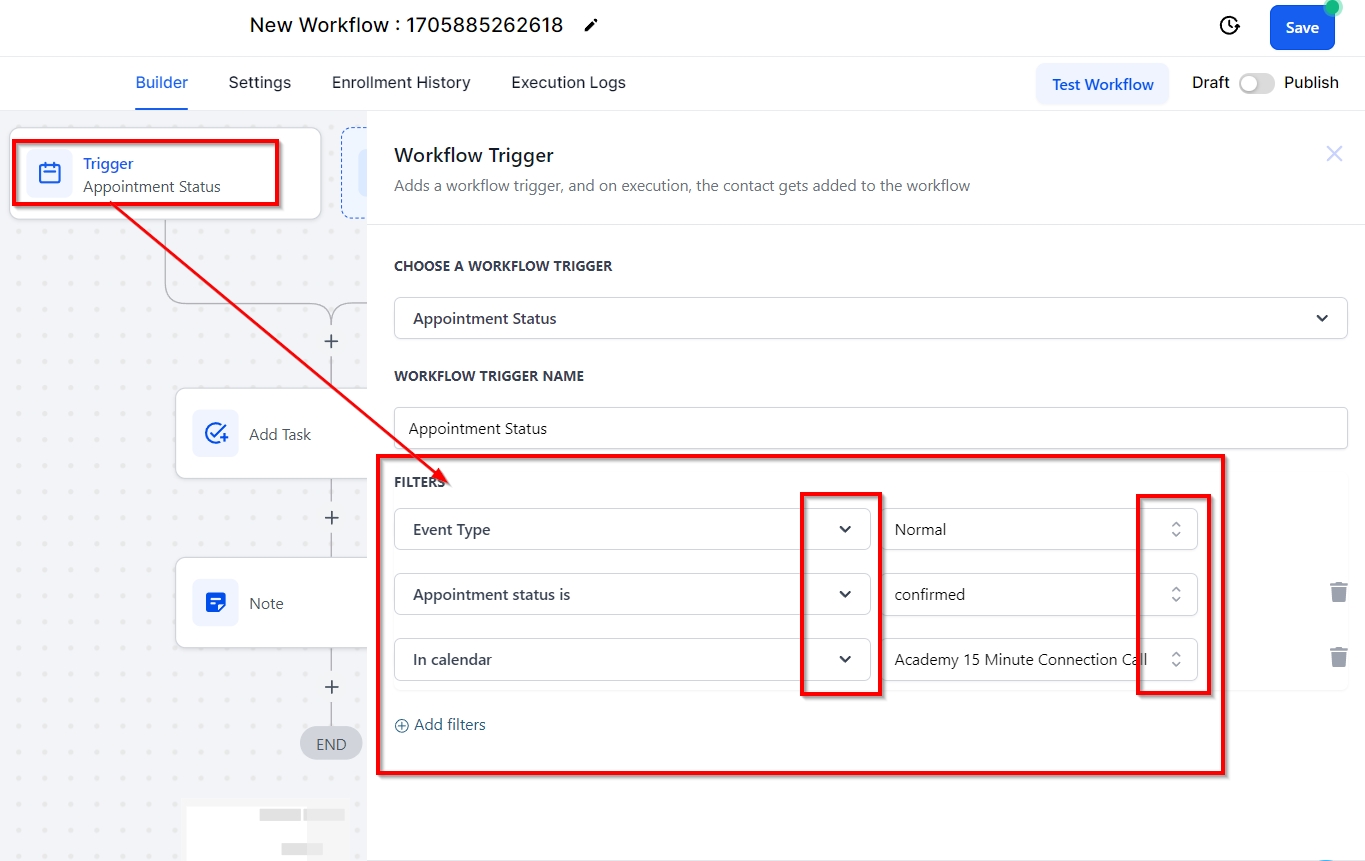 Then, choose the trigger. In this case, I am going to choose "Appointment" with the filters of "In Calendar" and "Appointment Status is" to only trigger off of New appointments on my appt. calendar.