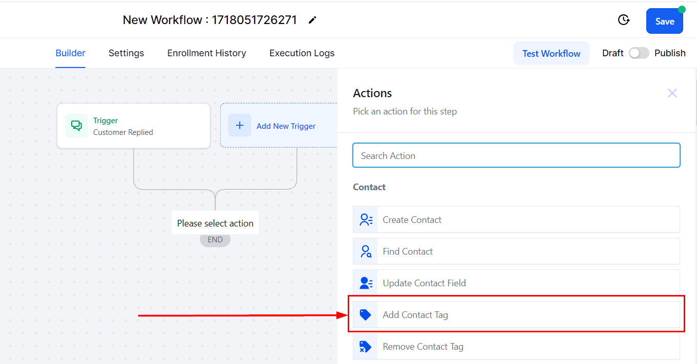 Create a new automation and select WhatsApp as the trigger (e.g., customer replied).