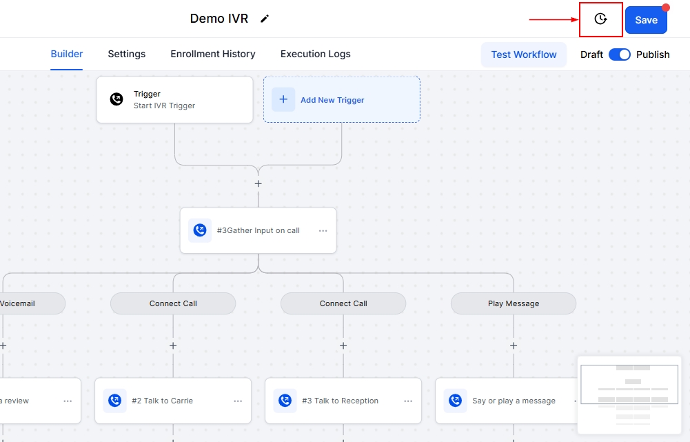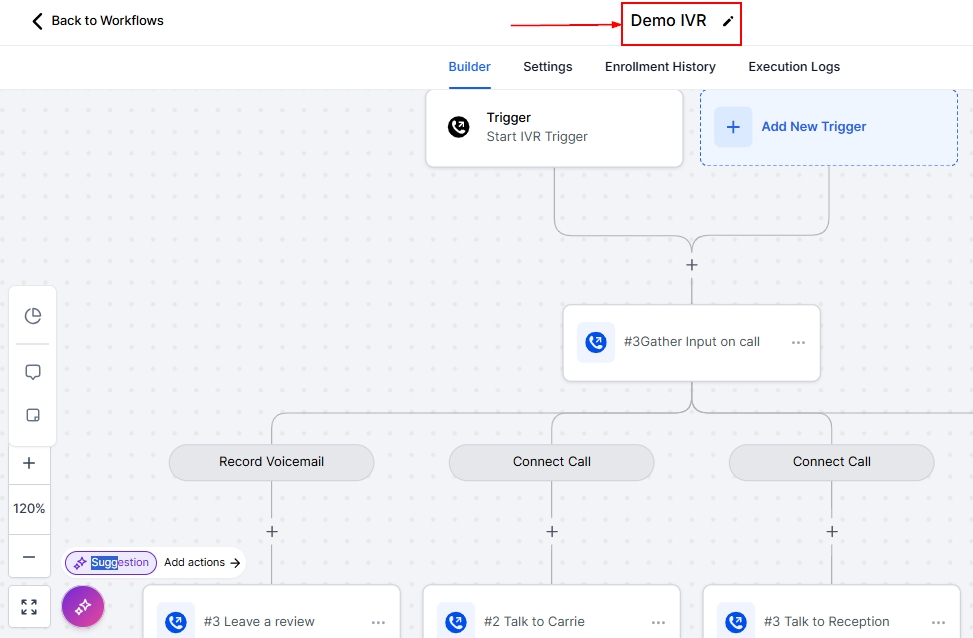 At the top of your Workflow Builder page, you'll find the Workflow Name field. Always name your workflows in a way that reflects their purpose. For example, if the workflow sends a text message to someone who missed a call, you might name it "Missed Call Text-Back." A clear and concise name helps you identify workflows at a glance.